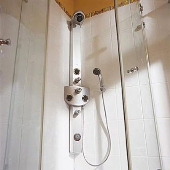 Shelf mounting will be easier provided that water pipes are connected to the piece of furniture. Those who want to use both a bathtub and a shower cabin use a corner shower panel. This panel will allow you to combine the bath with the shower, and do without a cabin (equipping a sauna). It is also suitable for individual design boxes.