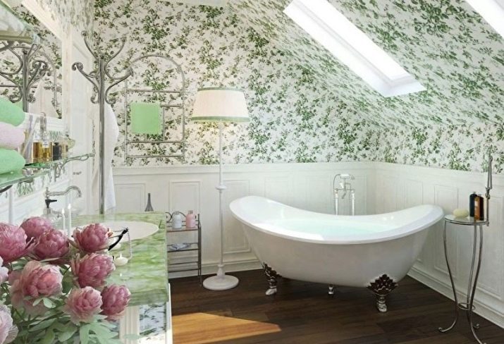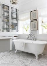 An interesting element of the interior composition can be screen. It can be placed at the panoramic window, thereby ensuring the privacy of the hygiene procedure. Someone chooses original figurines, natural flowers, rugs to maintain the style. Someone likes to decorate the bathtub with a floral print, complement the interior with such unusual accessories as a floor mannequin or openwork cage.