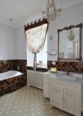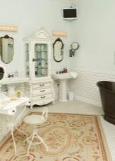 Faucets and handles should be bronze or chrome, made in antique or retrodesign. We must not forget that each element of the arrangement is not only functional, but also a decorative thing. A mirror, a heated towel rail, shelves and a laundry basket should correspond to style resources. You have to mask the washing machine, as modern technology will destroy the integrity of the style.