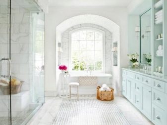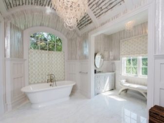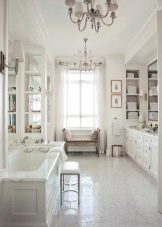 The interior of the Provencal style is practical and functional. He is deprived of pretentiousness and does not require the purchase of expensive ultramodern furniture and plumbing. It is distinguished by creative inspiration, sophistication and rustic beauty. This is a sea of sunlight, a spacious room, the installation of a massive font, the presence of ceramic accessories and antique fittings.