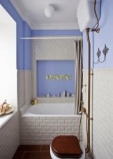 Do not glue wall tiles with large and catchy floral print - the necessary atmosphere is lost from this. As a finish, you can use moisture-resistant wallpaper or water-dispersion paint. If you want to use plastic panels, you need to select the print and texture as accurately as possible. Gloss is unacceptable; wood can be transferred through quality printing. In addition, you can trim part of the wall near the bathtub with marble.