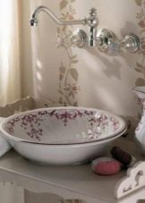 Will look great in a Provencal style bathroom marble countertop. The sink can be built-in, laid on or with a pedestal. It is best to convey the atmosphere of antiquity can overhead version of the washstand in the form of a round bowl with a design for the XVIII century sink. It can be supplemented with a jug, in which, for example, bath bombs can be placed.