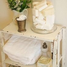 In addition to jugs and vases, Provence-style bathroom accessories will become wicker coasters, boxes for bathing accessories. Fluffy terry towels, as well as light-colored bathrobes lying in plain sight, look beautiful against the background of the general situation.