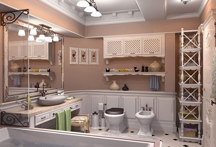 Cabinets can have storage systems with different opening and closing mechanisms. Floor cabinets with drawers and lower open shelves are relevant. Install them both under the sink and near it. Extra spacious bathrooms come with wicker chairs. It is necessary to choose furniture with an antique design (curly legs, embossed edges, cross frames).