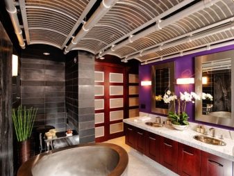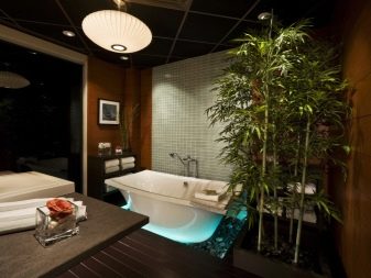 An important point is lighting. It is always bright in such a bathroom. It is recommended to install several small lamps around the perimeter of the ceiling, or hang Chinese lanterns soaked in moisture.