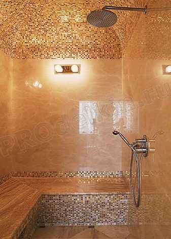 The mosaic ceiling looks luxurious. Mosaic tiles are glass, ceramic, metal and even composed of pebbles. On sale you can find ready-made compositions with a specific pattern. By the way the mosaic can also be laid on the floor - with such a finish, the interior of the bathroom will look really chic.