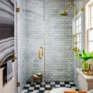 - Another beautiful option for tiling the bathroom. By using tiles of different colors, you can visually divide the room into functional zones.