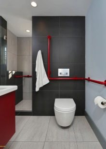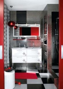 - The bathroom in red-gray color scheme looks gentle and romantic.