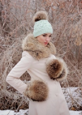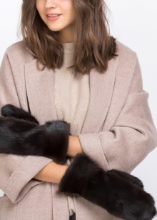 You can wear a classic coat with such mittens. But in this case, it will be correct for some accessories from fur to be present. For example, a scarf with fur pompons.