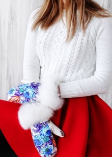 Mittens can be not only monophonic, but also printed. This is especially true for combined models of leather, suede or wool. The fur in these models acts as a decorative element or a fluffy edge. And as a print, any pattern is selected - from classic snowflakes to flowers, abstraction and oriental ornaments.