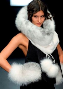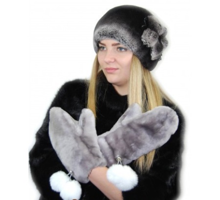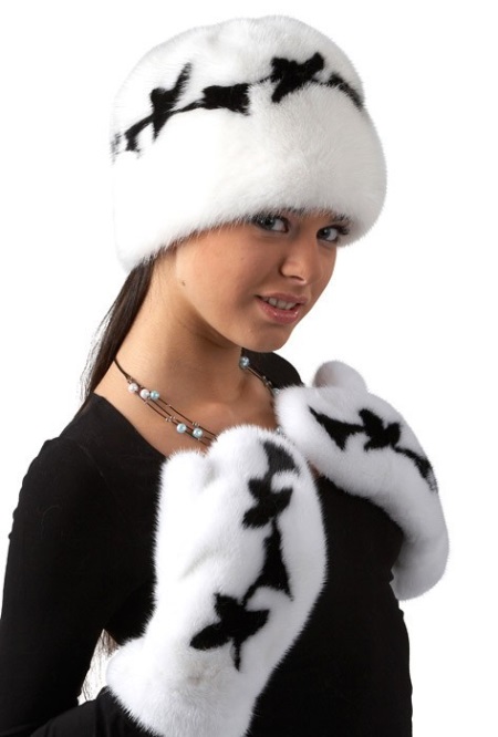 Fur mittens can be not only an independent part of clothes, but also an element of the whole set. In this case, the hat and mittens are made of snow-white fur and decorated with a flirty black print. This kit looks very expensive and elegant.