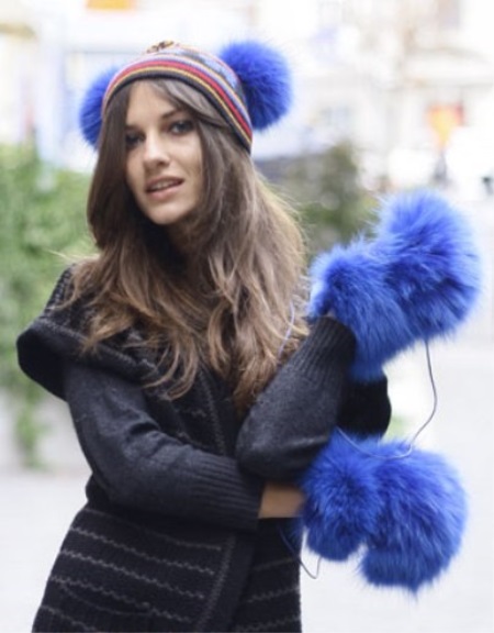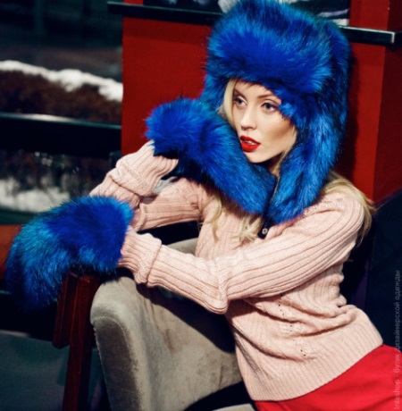 Faux fur does not go out of fashion! Gorgeous bright blue mittens look great complete with the same color with a cap with earflaps. Such an unusual, stylish headset will certainly attract the enthusiastic looks of the people around it, due to its unusualness and brightness.