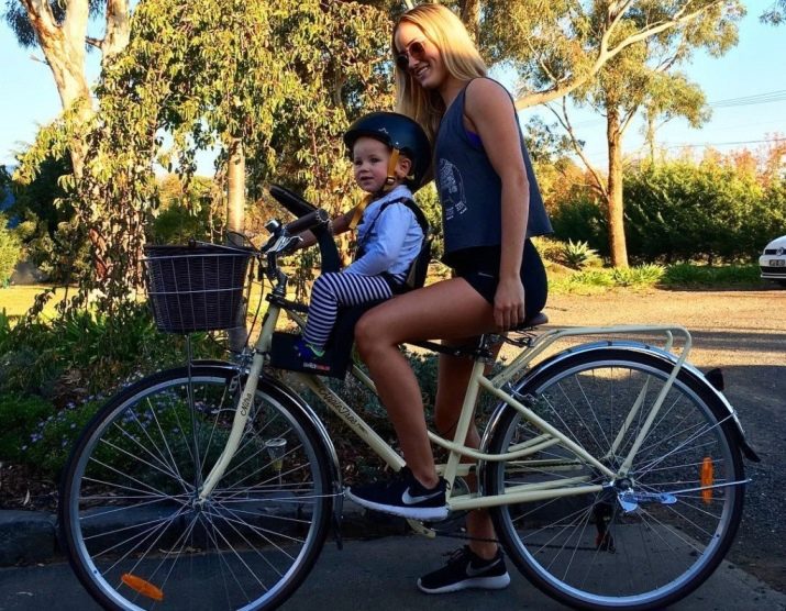 - A bicycle saddle for a child on a frame is ideal for unhurried walks along the city alleys. This moment will allow mom to replace the use of a stroller for daily walks with the baby, combining such a pastime with cardio and physical activity.