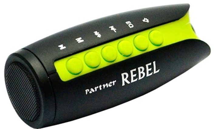 - Partner Rebel. Inexpensive speaker with bright design. The sound is monophonic, button control, there is Bluetooth, a built-in flashlight, support for memory cards.