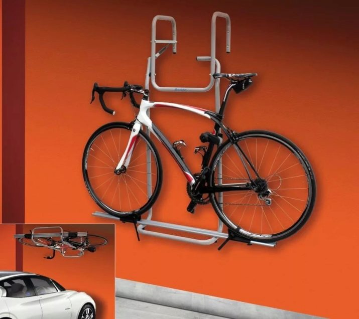 Special products for bicycle storage. Folding options stand out for their impressive weight and constitute a system of metal alloys, equipped with holders with a rubberized surface.Among the positive features of this design is worth noting its reliability. Besides, most of the products additionally have several small hookswhere you can store accessories and other devices.