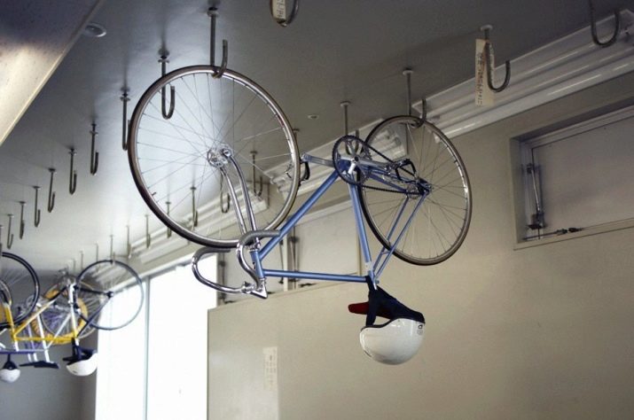 This method of placing one or more bicycles preferred for apartments, houses or non-residential premises in which the ceiling height will exceed the average. In order to further locate the vehicle under the ceiling, the installation of a special lifting mechanism will be required. It usually consists of several hooks or brackets.
