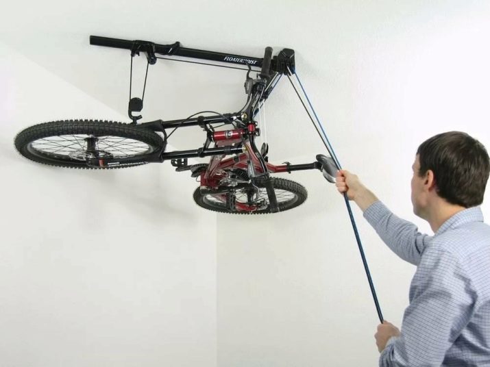 There is also an easier way to store the bike at the top, which makes it possible to make the lifting mechanism yourself. For this purpose a pulley and rope are used. Adjustment and control are subsequently carried out manually.. The model stands out for its simple design, ready-made mechanisms have an affordable price.