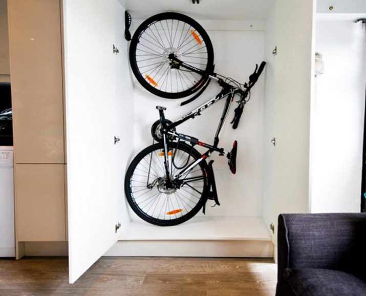 Perpendicular option - the idea for storing bicycles in cramped spaces. Using the appropriate fasteners, it will be possible to arrange the device for riding in such a way that it will occupy a minimum of space. Among the suitable areas in the room for perpendicular placement, it is recommended to use the gaps between the wall and the cabinet, the refrigerator, the front doors, the washing machine, the bed, etc.