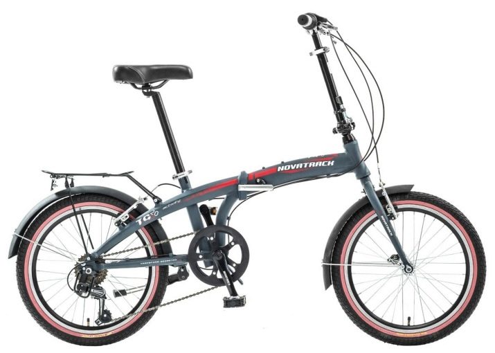 Novatrack TG-20 6 - a bike for the city with an aluminum frame, 6-speed transmission, folding mechanism. In the presence of a rigid rigid fork, wheels with a diameter of 20 ″, V-brakes, a convenient direct steering wheel with adjustable lift.