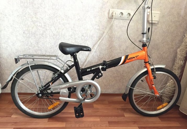 - Folding bike Next 100. Model with steel frame and folding steering wheel. Wheels with a diameter of 20 inches are ideally suited both for city, and for country roads. The bike is equipped with V-brakes and one high-speed mode, as well as a footrest, rear trunk and bell.