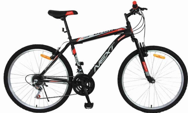 - Mountain bike Next Ozone 26 ''. A good option for both city walks and cycling. Equipped with V-brakes. Has double rims, adjustable seat. The frame is designed for height 165-185 cm. The model has a soft speed switch with 18 modes. Comes with a plastic bottle for water and mounts for it.