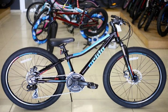 Mechanical disc brakes provide a smooth but quick stop, and parents can not worry about the safety of the child. The bike has 21 speeds, an aluminum frame and a solid male design in black with blue and red details.