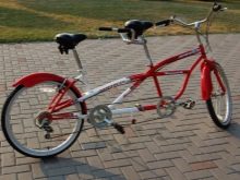 From the neighboring, larger sprocket of the rear pedals, the second (main) chain starts up already on the rear sprocket (or multi-stage cassette) of the rear wheel. This is what improves the efficiency of the efforts exerted by the "stock" cyclist, and the front only effectively adds its own effort. This is another reason why it’s impossible to steal a tandem alone. Tandem bicycle for adults is a model with a full frame size of 21-22 inches. The four-wheel tandem is more like a cycle car.
