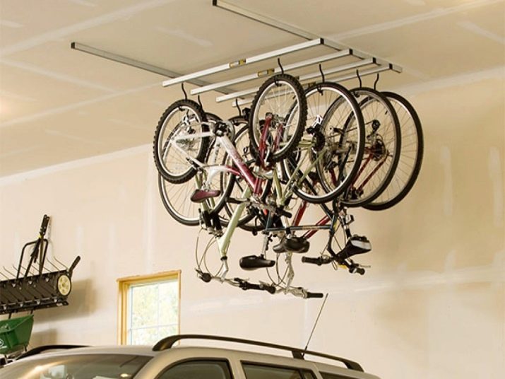 A convenient way of horizontal ceiling storage is the so-called bike lift. You can buy it in specialized stores. It is a lifting mechanism, fixed to 2 blocks that are attached to the ceiling. Each unit has several holes for mounting the mount. According to the provided scheme, a length-adjustable rope is passed through fasteners, hooks and roller guides.