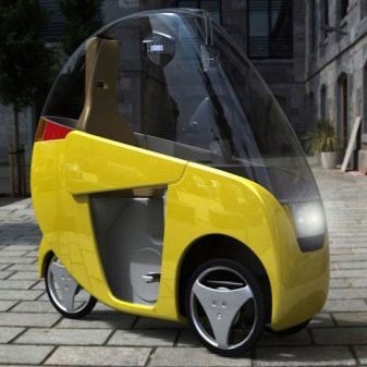 This is a fairly stable construction of a closed type. It has three wheels and a cab, like a car driverthanks to which the trip becomes even more comfortable and safe.