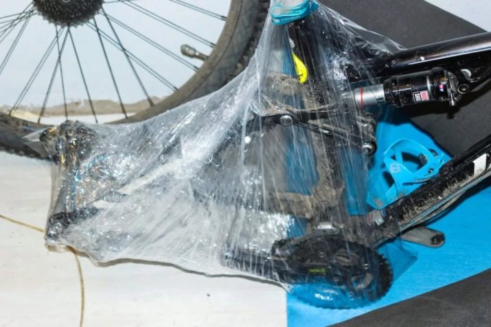 Previously, everything unnecessary is removed from the bicycle, the pedals, the front wheel and the saddle are removed. Then dismantle the steering wheel and rear wheel. The switch is seized with a plastic clamp inside the rear triangle, pedals are also attached there. They put the bicycle on a karemat and fix it with tape so that the mat does not fall off.