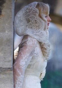 - Hood - A convenient image element resembling an ordinary hood, with an extension to the shoulders, fastens with buttons. A variety of such a product can be considered a spacious cloak - "cloak". Its length can reach the floor. A dress with a train looks especially harmonious with this drop-down accessory. Favorite option for modest brides who worship religious charters.