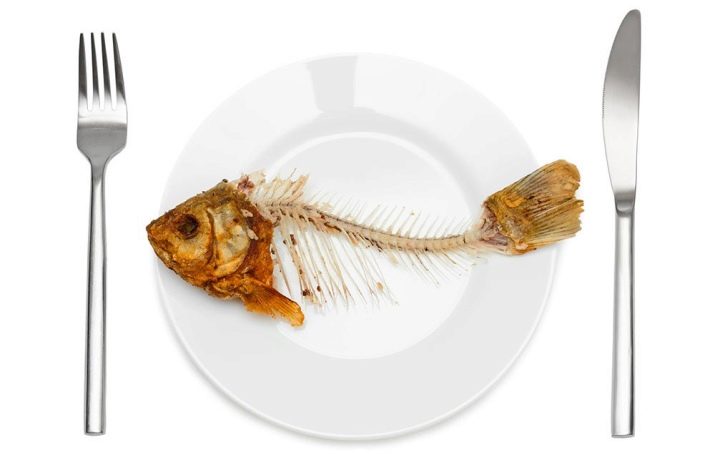 Small fish bones are often present in fish dishes, even if served with processed fillet. Such bones cannot be pulled out by hands - this is a violation of etiquette. If you suddenly felt a fish bone in your mouth, you must carefully move it with your tongue to your lips and remove it from your mouth with a fork. Then it can be transferred to specially designed dishes or on the edge of your plate.