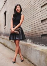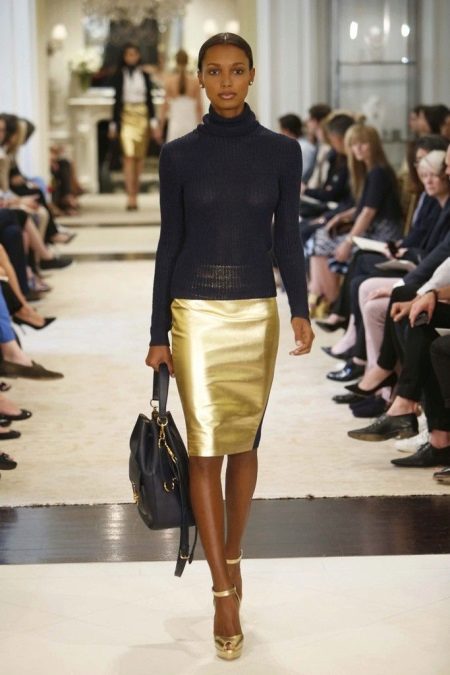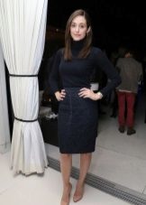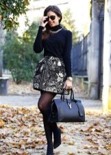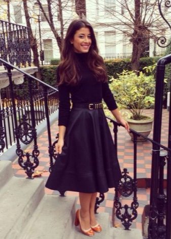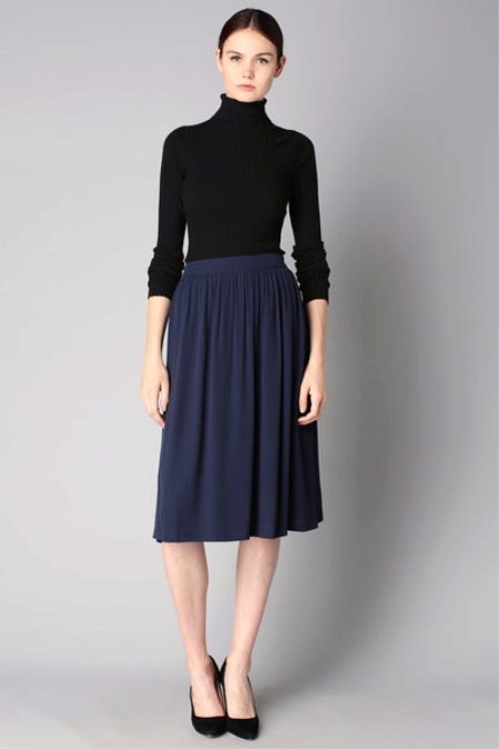 A black turtleneck complete with a navy flared skirt below the knee is a particularly elegant look. Suitable for going to the theater and work, as it looks very presentable. Mandatory shoes with heels.