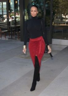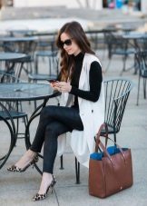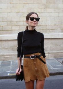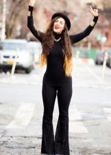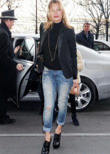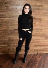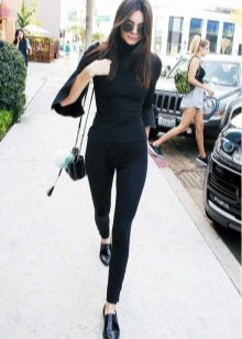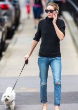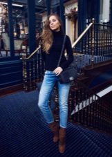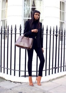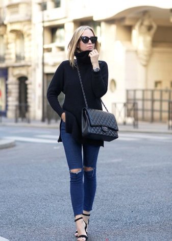 Black turtlenecks are great for jeans of all kinds, including worn ones. The best shade is dark blue. This is a great option for traveling, walking and shopping. Its main difference is practicality. Turtlenecks are combined with mini or midi skirts (to the knees). It can be made of cotton, tweed or leather.