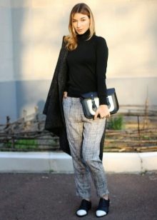 Turtleneck + pants with a goose foot pattern. An interesting necklace on the neck emphasizes in the image of charm and femininity.