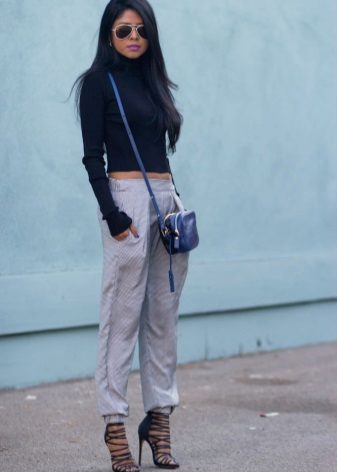 For a relaxed atmosphere, choose casual pants - baggy or chinos. They can be bright colors, in a cage or with a different print. Add a black belt and put on a leather jacket, a leather jacket, coat or trench coat.