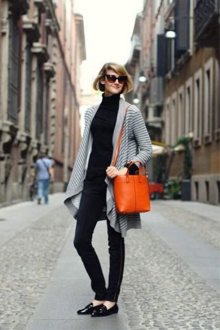 A turtleneck with jeans is an image of a big city. Knitted elongated cardigan is successfully combined with a turtleneck and loafers on a flat sole. The emphasis in the image is on the bag of red color.