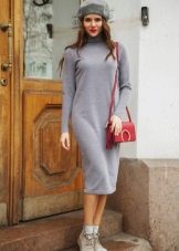Gray turtleneck dress for the office. A tight-fitting midi dress. Additional details - a seam in the center and a cut. We select tight black tights and a black bag. Chic and relevance.