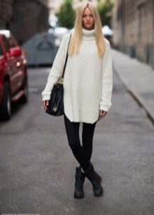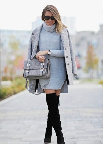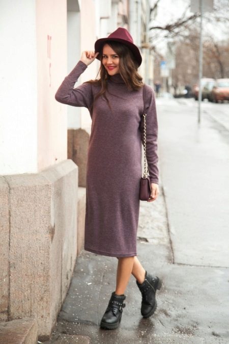 Turtleneck dresses with a hat - a spectacular look for a walk. Opt for an informal, slim-fit silhouette. Pick up a bag and hat of the same color. Wear coarse shoes.