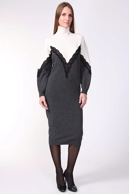 White and gray turtleneck dress with details. Particularly stylish dress. Length below the knee, a combination of two colors, loose fit sleeves and black lace. Necessarily high heel shoes. Such an elegant dress can be worn in the office or in the theater.