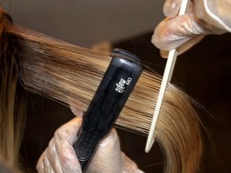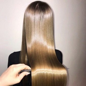 - Hair is divided into thin locks and each is leveled with an iron. From exposure to high temperature, the components of the composition are sealed inside the hair, which provides a long-lasting effect. This stage is the longest and the most exhausting. For thick hair, a higher temperature (220 degrees) is chosen, it will be enough to heat the iron to 170-190 degrees thin.