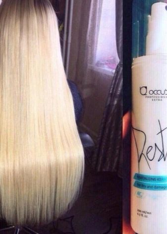 Liquid keratin is found in Gliss Kur sprays, which many women have been using for more than a year. The tool is perfect for all types of hair, helps to restore their shine, elasticity and silkiness. Perfectly restores damaged strands after staining, perm, and other procedures. Spray from this brand is easy to apply and spread over the entire length of the curls. A noticeable result occurs after the second or third application.