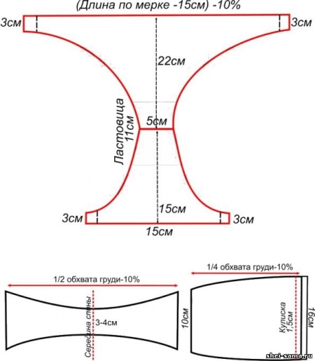 Each strip is divided into two equal rectangles with the following parameters: length - half-circumference of the chest, multiplied by 0.88 minus 4 cm (shortening the length compensates for the stretching of the tissue); height - 12 cm. Add to this 1 cm each for overlock and hemming.