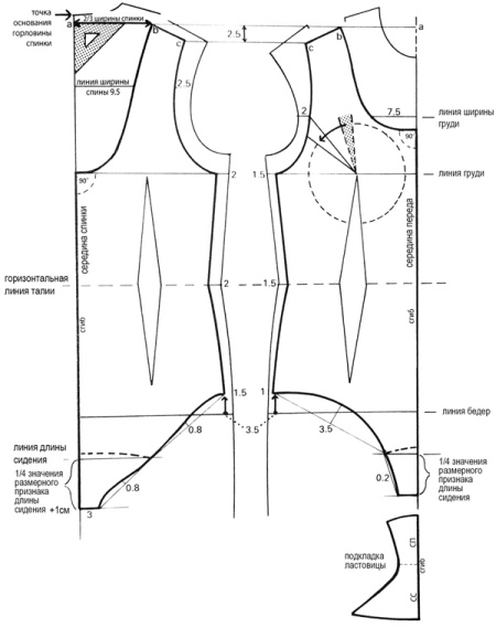 To make it easier to draw up a pattern for a one-piece bathing suit, we will use the standard pattern for a dress pattern. We copy or redraw the front and back parts of the pattern, making sure that the mid-spins of both parts are parallel and that the lines of the chest, waist and hips (horizontal lines) are at the same level.