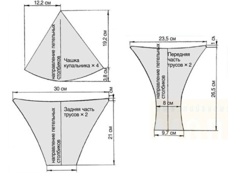 Please note that when making a swimsuit from elastic fabric, all additional elements (such as linings) must also be made of elastic fabric or cut in a diagonal direction - this will also give them elasticity.