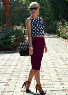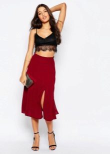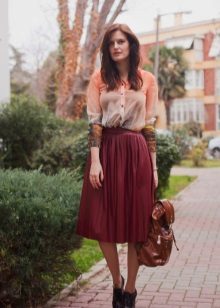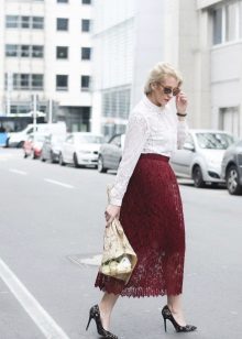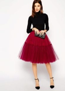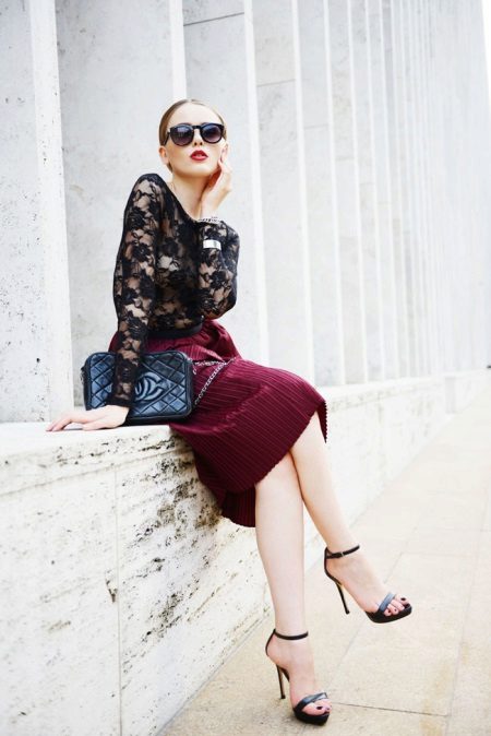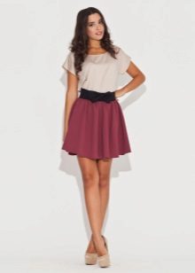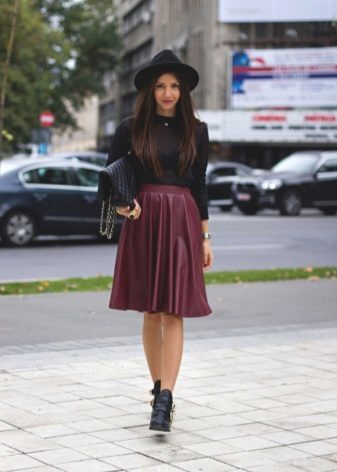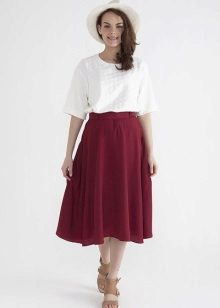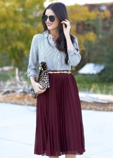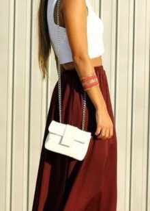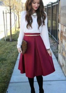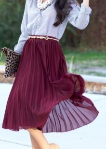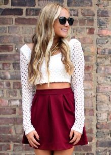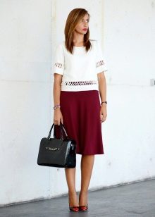 White, black, gray or beige tops and laconic shoes of the same colors will be a great addition to all burgundy skirts. Such images can be, and sometimes it is desirable to dilute with bright plain accessories, for example, a bag, neck scarf or belt.