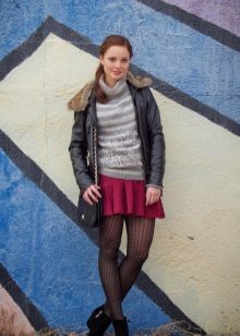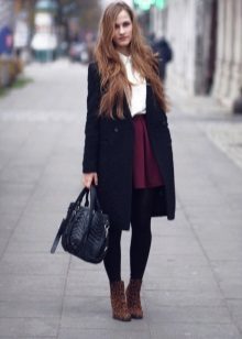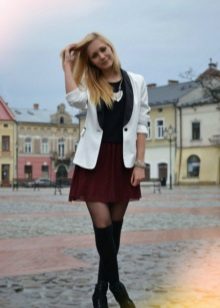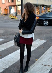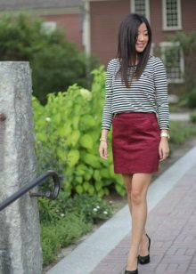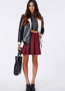 For a short burgundy skirt, a short jacket, stylish jackets and flat shoes, for example, sneakers or sneakers, are great.