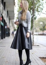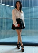 To get an official bow for everyday life in the office, a midi-length leather skirt should be complemented with a white chiffon blouse and black boats.