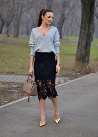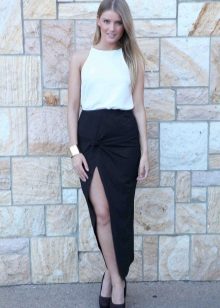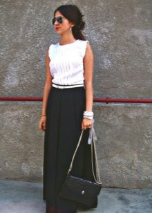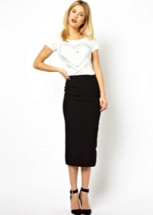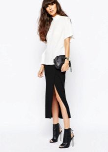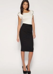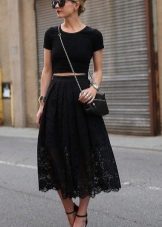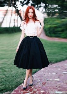 This length of black skirts is in demand for both casual style and office bows. Midi skirts for long-legged beauties are most preferred. They are successfully combined with a top contrasting in color and complemented with suitable accessories.