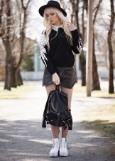 For a bold and slightly brutal look, wear a satin corset and a cropped leather jacket to a black leather skirt, complementing the outfit with massive boots or sneakers.